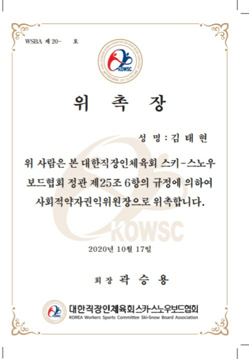 11일 대한직장인체육회 스키스노보드협회(곽승용회장)는 관악구 사무실에서 위촉장 수여식을 진행했다.