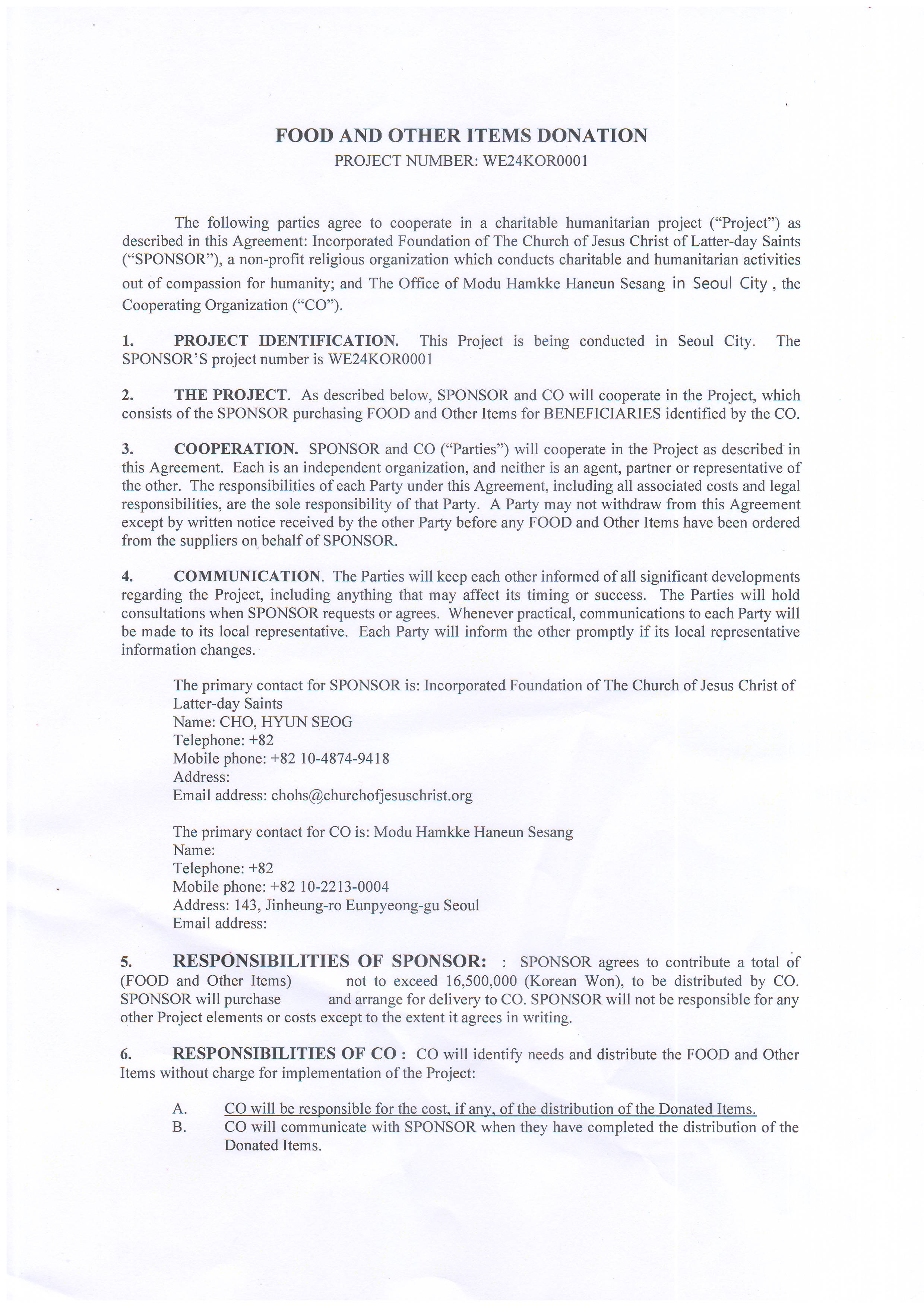 예수그리스도후기성도교회에서 기부받아 여러 단체에 기부함